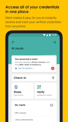 *Check-in -- Easily check-in and get verified at events by using your Merit Key. Make it fast and easy to prove your credentials.