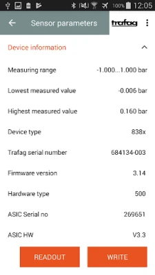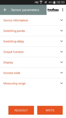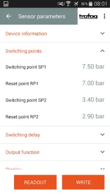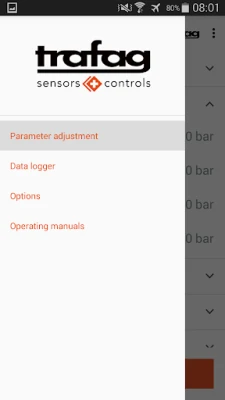 The recorded data of the built-in data logger in the devices are displayed in a graph and can be easily analyzed. The data can be saved in csv format for later comparisons and analyses. For advanced analysis, e.g. spreadsheets, the recorded data can be exported or sent by email. The app can be used in conjunction with the electronic switch with display, DPC 8380, DPS 8381 and DTP 8180, of Trafag with integrated Near Field Communication.